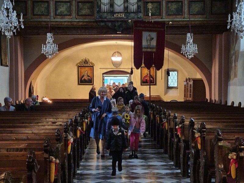 als Symbol für alle anderen Lebensmittel, die in Erde gewachsen sind. Über die und mit denen wir uns freuen dürfen. Dieser Apfel, den er in der Hand hielt, ist in verschiedenen Farben gewachsen, wie auch wir alle unterschiedlich sind. Er ist wie viele andere Produkte für uns und andere geschaffen. Er nährt uns und andere. Die Frage, was beim Teilen des Apfels zum Vorschein kommt, beantworteten die Kinder richtig mit Gehäuse und Kerne. Ja Kerne, verdeutlichte er, die, in die Erde gegeben, wieder wachsen und für uns Obst- und Gemüse entstehen lassen. Für uns und andere. Er sei sehr dankbar, dass viele Erntegaben heute von Kindergarten-Kindern, unseren Jüngsten in der Pfarre, gebracht wurden. Sie, die Kinder, sind unsere Zukunft, die Perspektive nach morgen in Gesellschaft und Pfarre. Jung und Alt miteinander, erfahren diese Tradition, das Werden, Wachsen und Ernten erleben, nach Vollendung Dank sagen an unseren Schöpfer.