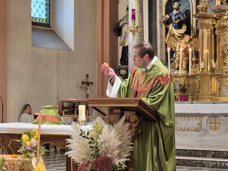 Der Herr Provisor feierte die Erntedankmesse mit vielen Gottesdienstbesucher:innen. In den Mittelpunkt seiner Predigt stellte unser Herr Provisor einen APFEL, knackig frisch, in bunten Farben,