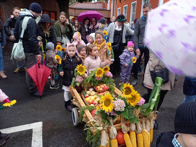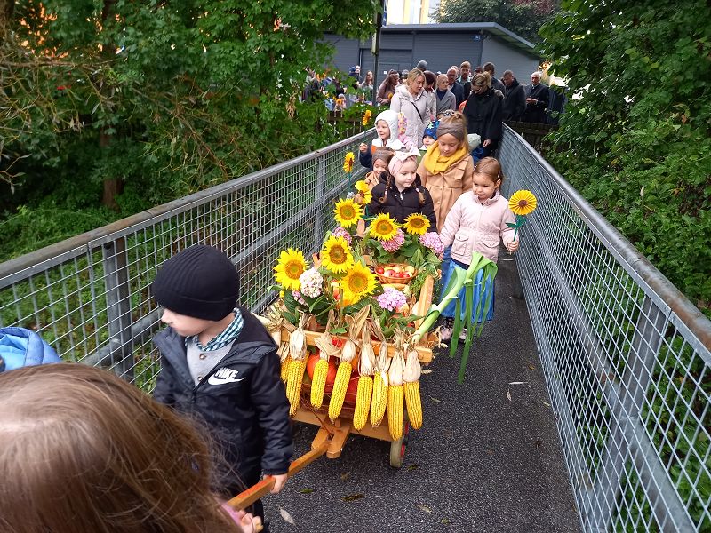 ihre Erntegaben im mit Sonnenblumen geschmückten „Leiterwagen“