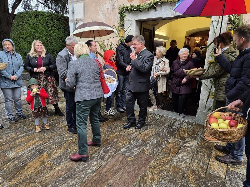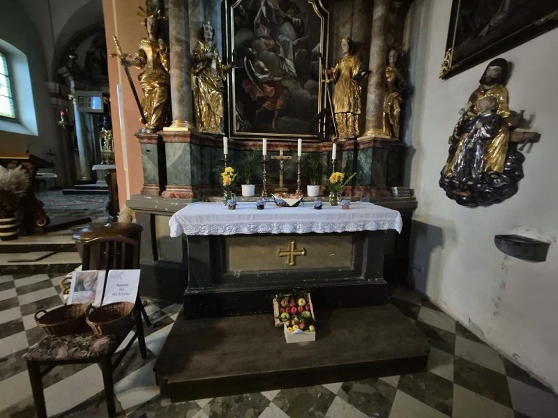 Der Herr Provisor feierte die Erntedankmesse mit vielen Gottesdienstbesucher:innen. In den Mittelpunkt seiner Predigt stellte unser Herr Provisor einen APFEL, knackig frisch, in bunten Farben,