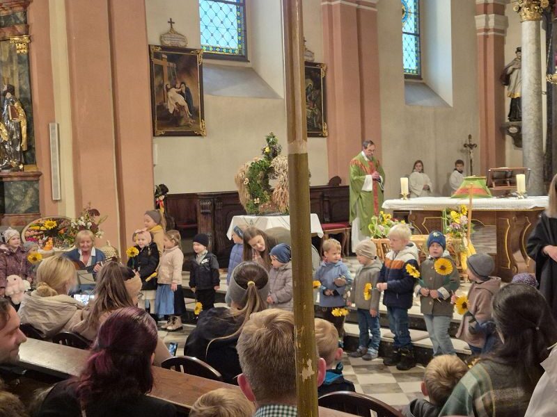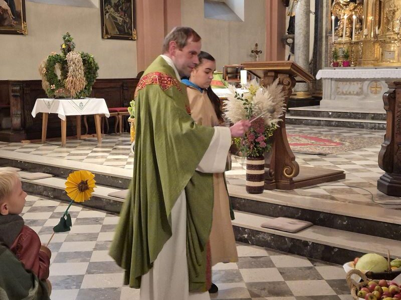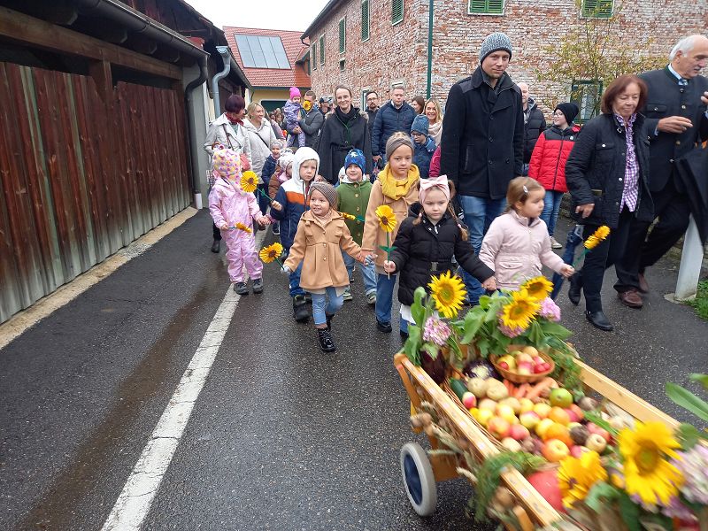 als Symbol für alle anderen Lebensmittel, die in Erde gewachsen sind. Über die und mit denen wir uns freuen dürfen. Dieser Apfel, den er in der Hand hielt, ist in verschiedenen Farben gewachsen, wie auch wir alle unterschiedlich sind. Er ist wie viele andere Produkte für uns und andere geschaffen. Er nährt uns und andere. Die Frage, was beim Teilen des Apfels zum Vorschein kommt, beantworteten die Kinder richtig mit Gehäuse und Kerne. Ja Kerne, verdeutlichte er, die, in die Erde gegeben, wieder wachsen und für uns Obst- und Gemüse entstehen lassen. Für uns und andere. Er sei sehr dankbar, dass viele Erntegaben heute von Kindergarten-Kindern, unseren Jüngsten in der Pfarre, gebracht wurden. Sie, die Kinder, sind unsere Zukunft, die Perspektive nach morgen in Gesellschaft und Pfarre. Jung und Alt miteinander, erfahren diese Tradition, das Werden, Wachsen und Ernten erleben, nach Vollendung Dank sagen an unseren Schöpfer.