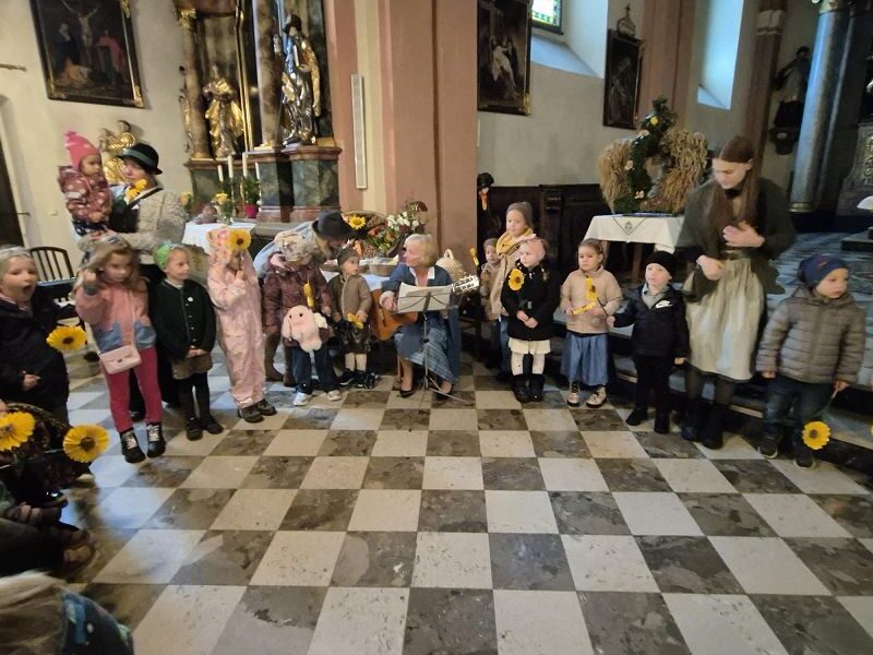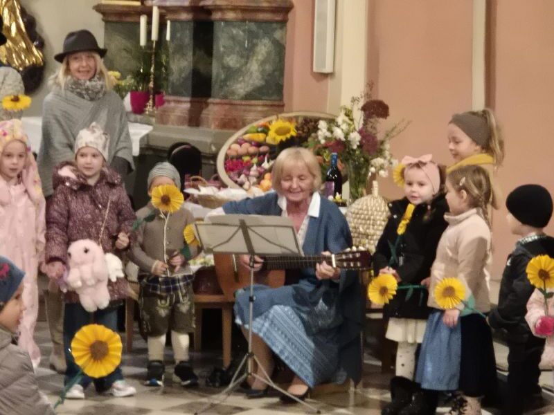 unserem Schöpfer das „VERGELT’S GOTT“ auf ihre Weise. Mit Liedern – Kindergartenleiterin Maria Gößler begleitete auf der Gitarre – und einem Gedicht.
