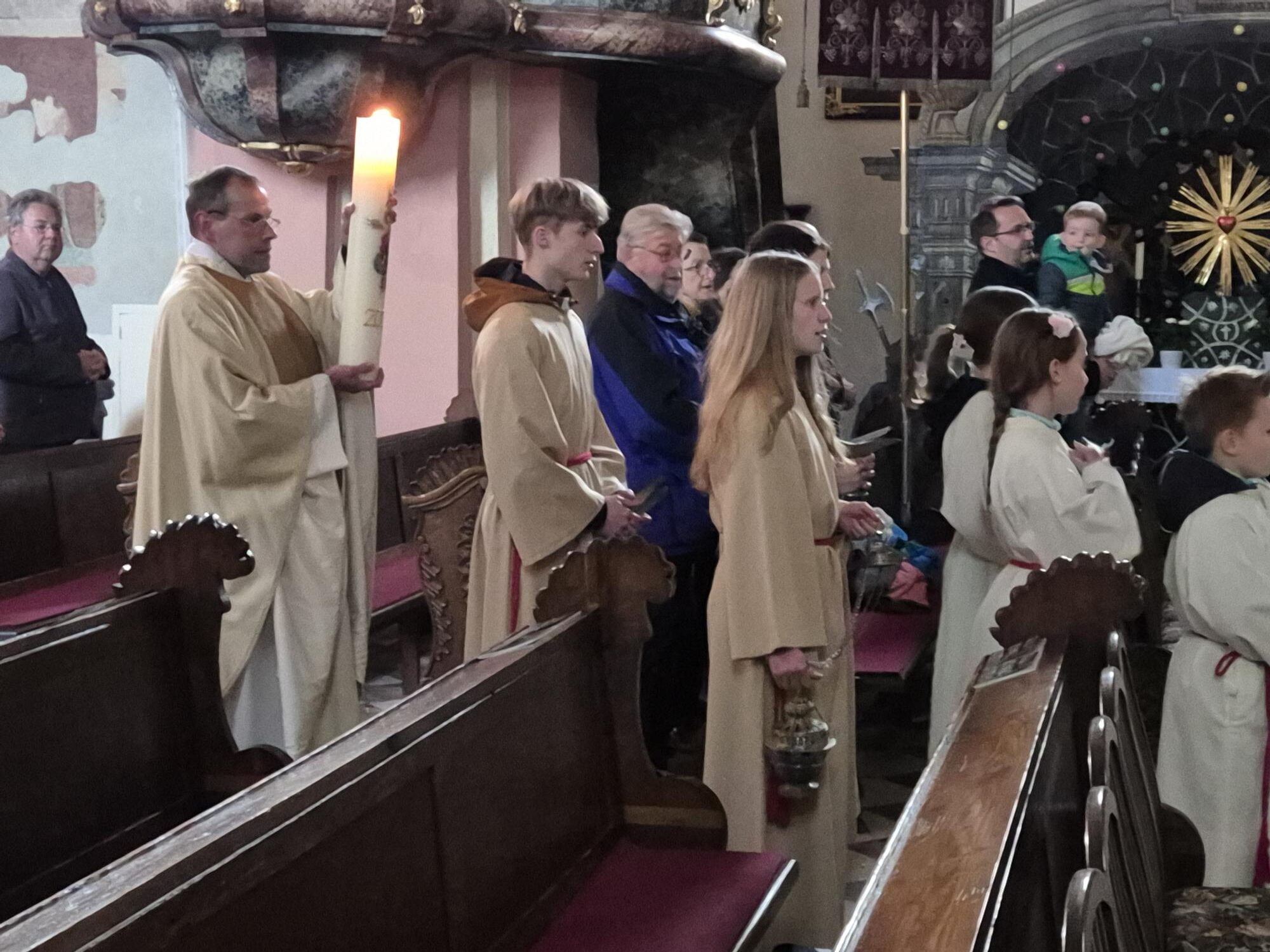 Dann folgt der Einzug zu „Lumen Christi“ in die dunkel gehaltene Pfarrkirche.