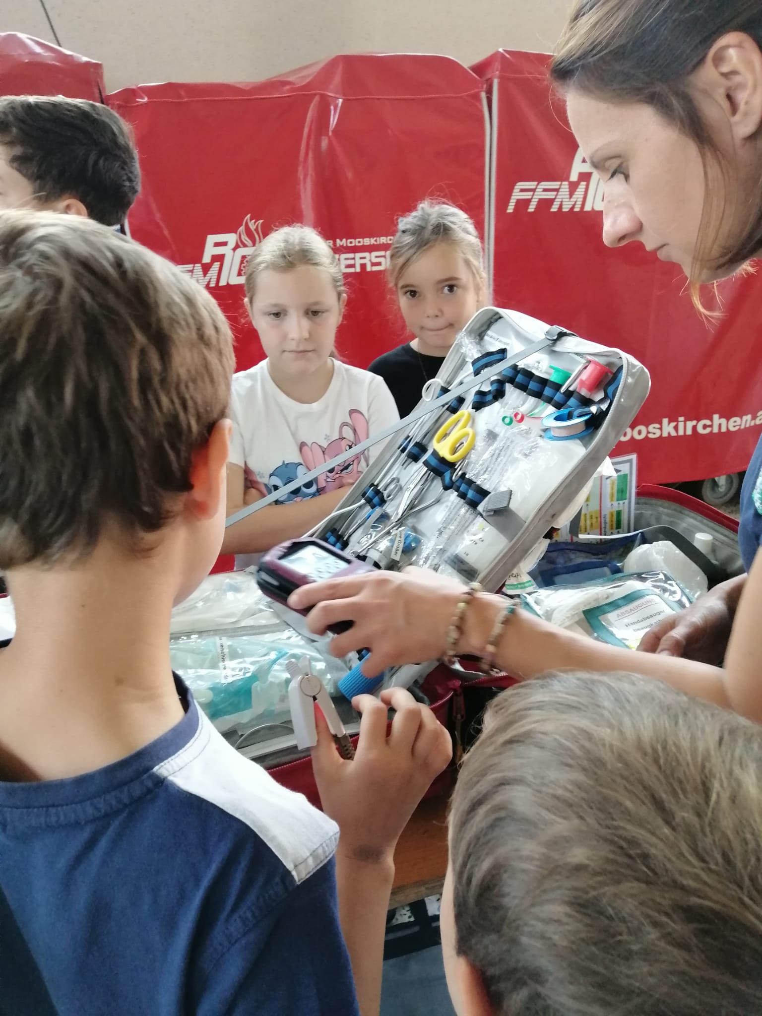 An der Erste-Hilfe-Station erfuhren sie, wie und womit Ersthelfer Leben retten können. Sie durften verschiedene Geräte und Materialien kennenlernen, mit denen im Ernstfall Erste Hilfe geleistet wird, und konnten selbst ausprobieren, wie man diese richtig anwendet.