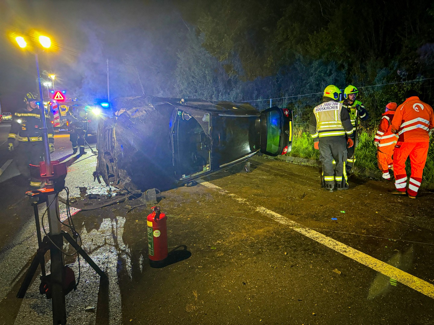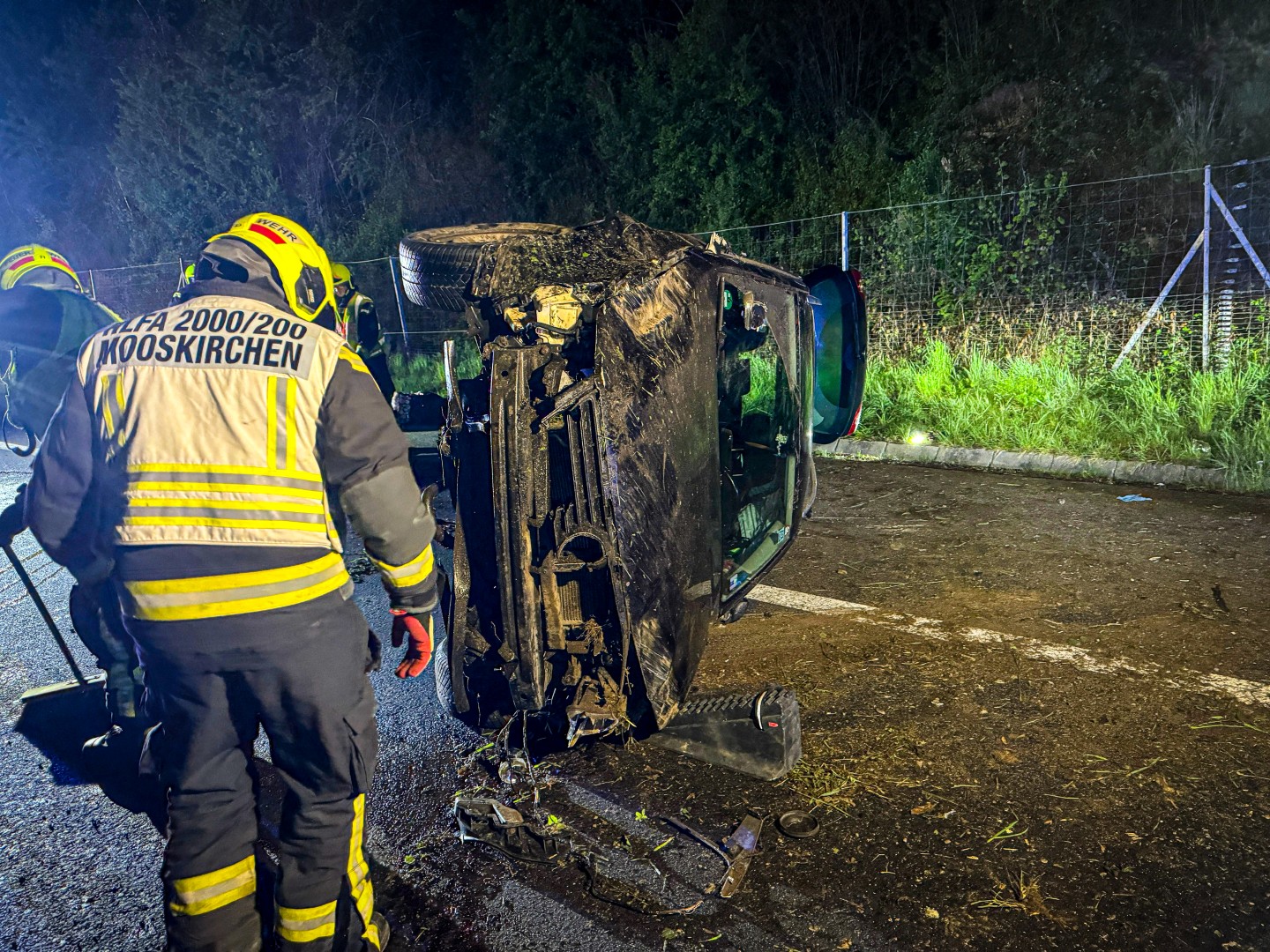 Alle vier Insassen konnten sich glücklicherweise noch vor dem Eintreffen der Einsatzkräfte selbst aus dem Fahrzeug befreien. Alle vier Personen mussten medizinisch vom Rettungsdienst und Feuerwehrsanitätern versorgt werden. Zwei Personen wurden im Anschluss mit Verletzungen unbestimmten Grades vom Roten Kreuz in ein Krankenhaus gebracht.