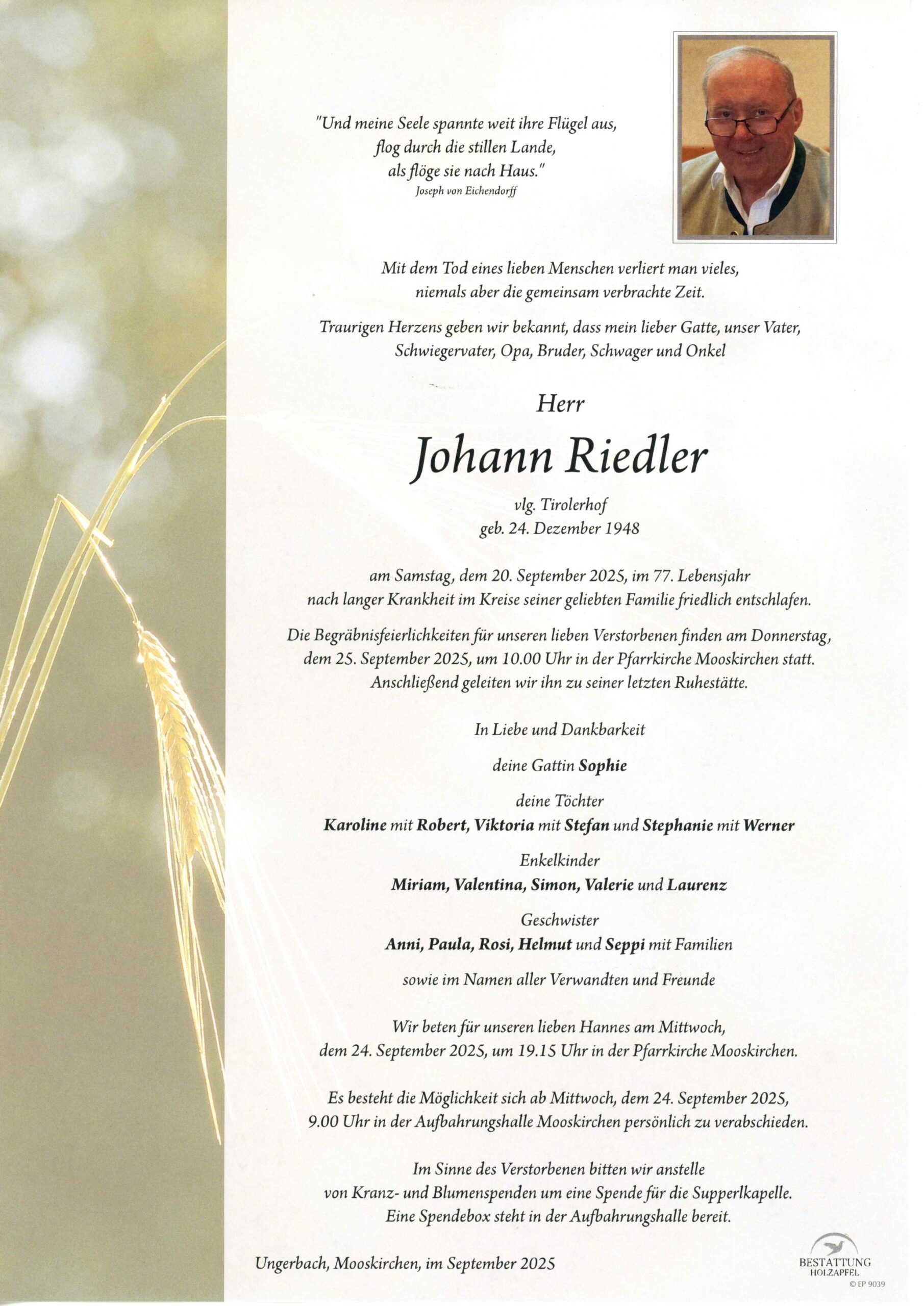 22. September 2025 2025-09-28 23:00Johann Josef RIEDLER – wir trauern sehr um ihn ….