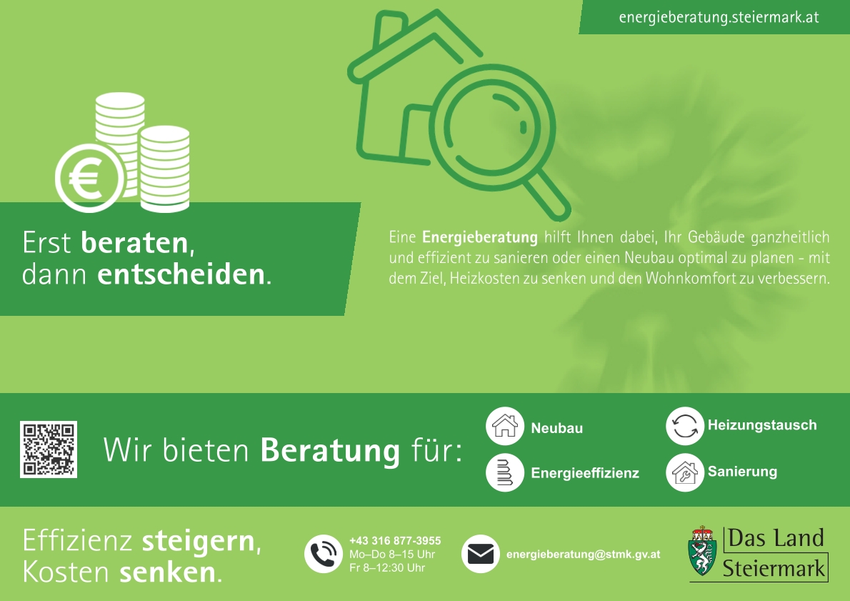 Beratungsangebote und weitere Informationen zum Thema Energiesparen finden Sie auf der Website des Landes Steimark HIER