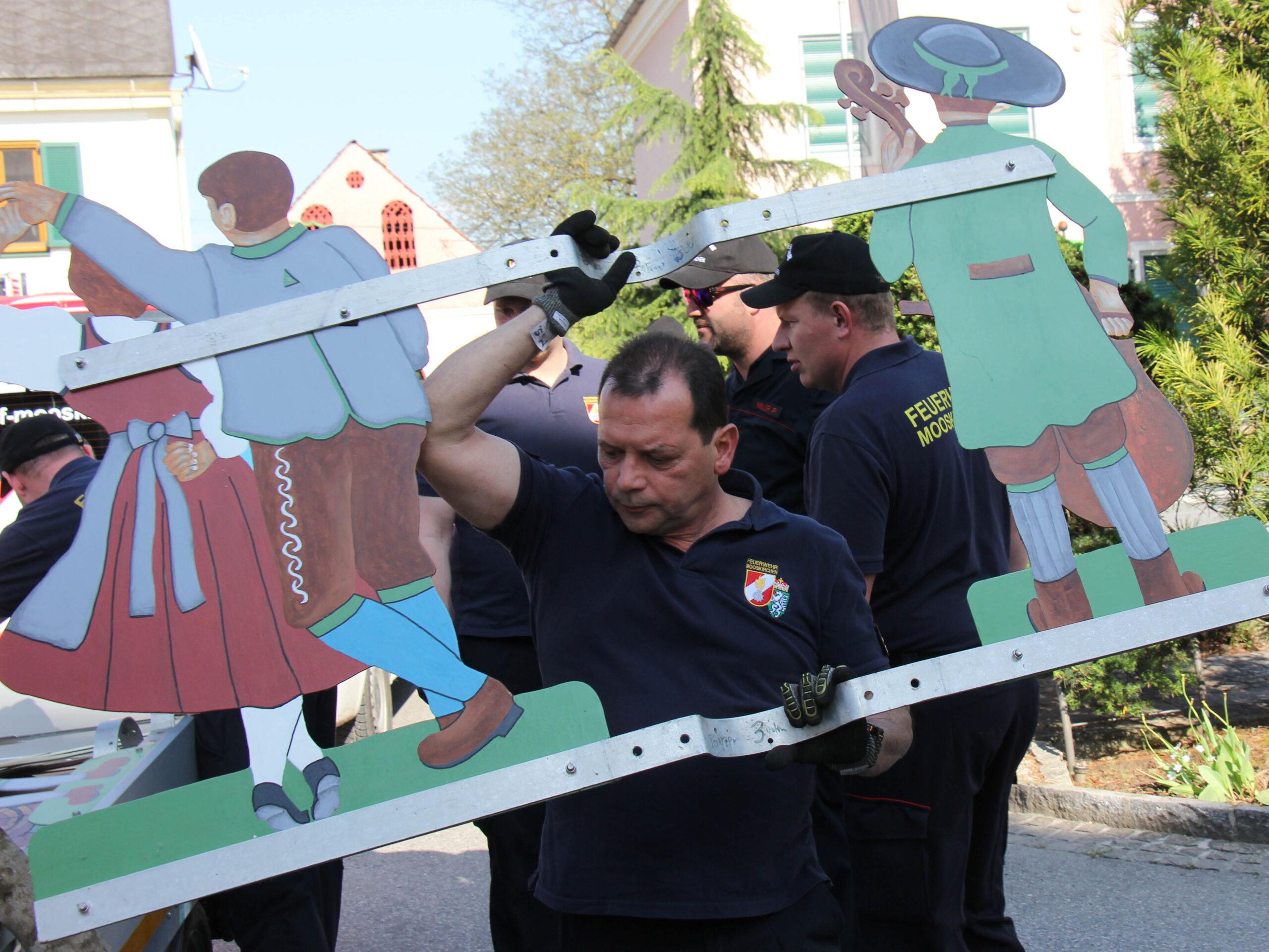 Der strahlende Sonnenschein wetteiferte mit der ausgezeichneten Stimmung der sich zahlreich am Marktplatz versammelten Bevölkerung. Pünktlich um 16 Uhr wurde der 22 Meter lange Maibaum von Mitgliedern der FF_Mooskirchen die Kurven zum Marktplatz gefahren. Empfangen wurde er mit Harmonikaklängen vom jungen Musiker Lukas Ruprecht.
