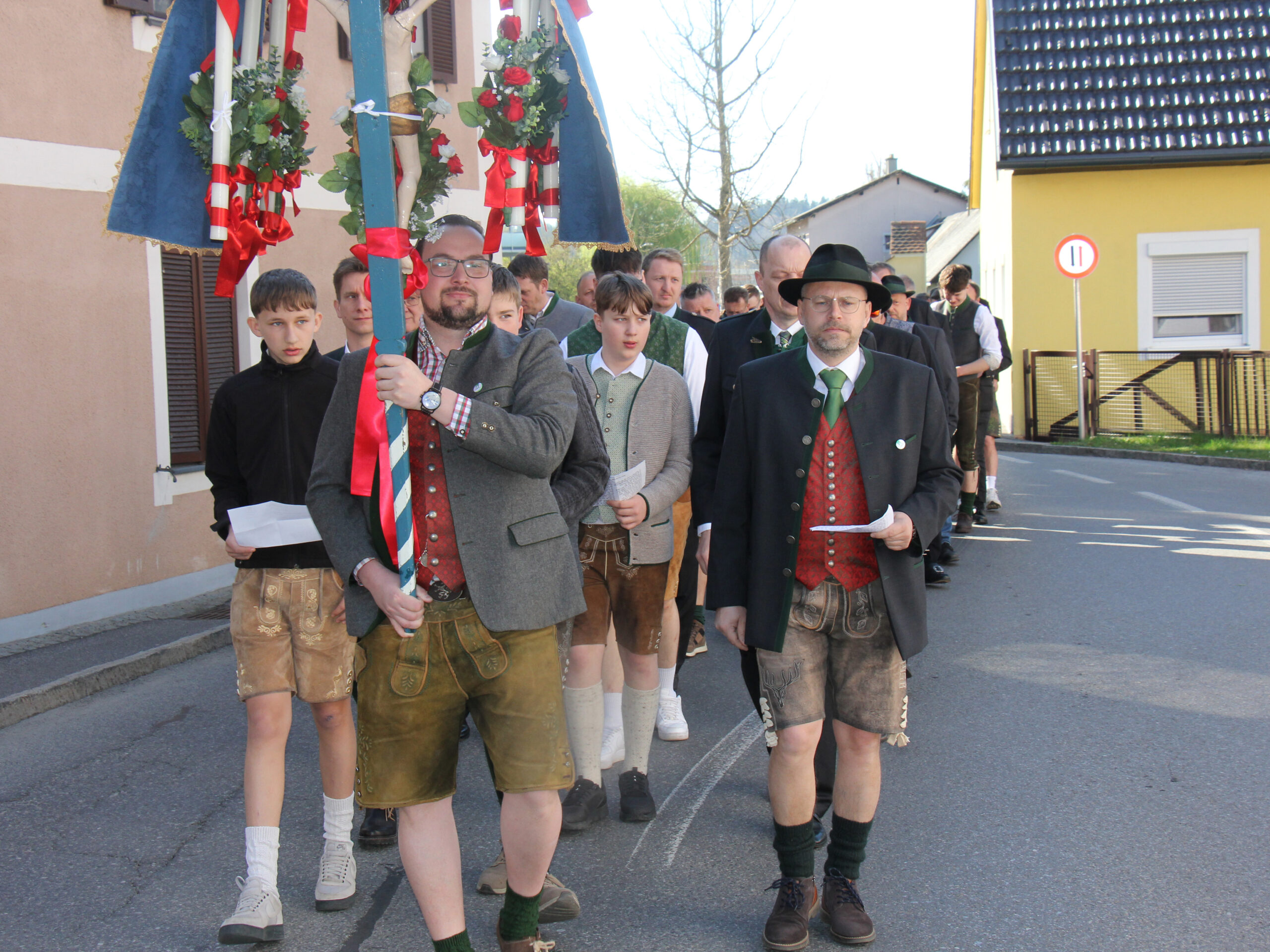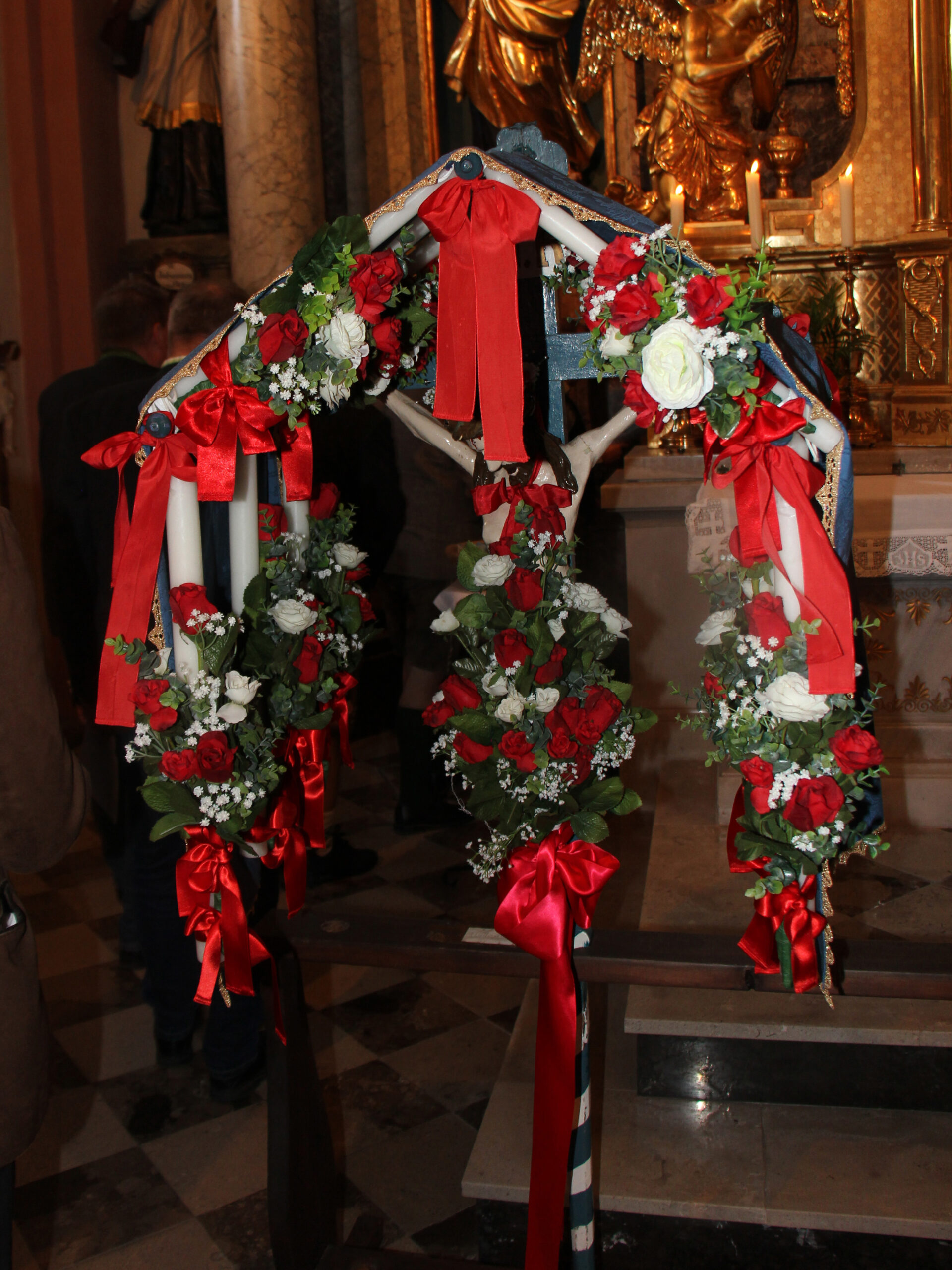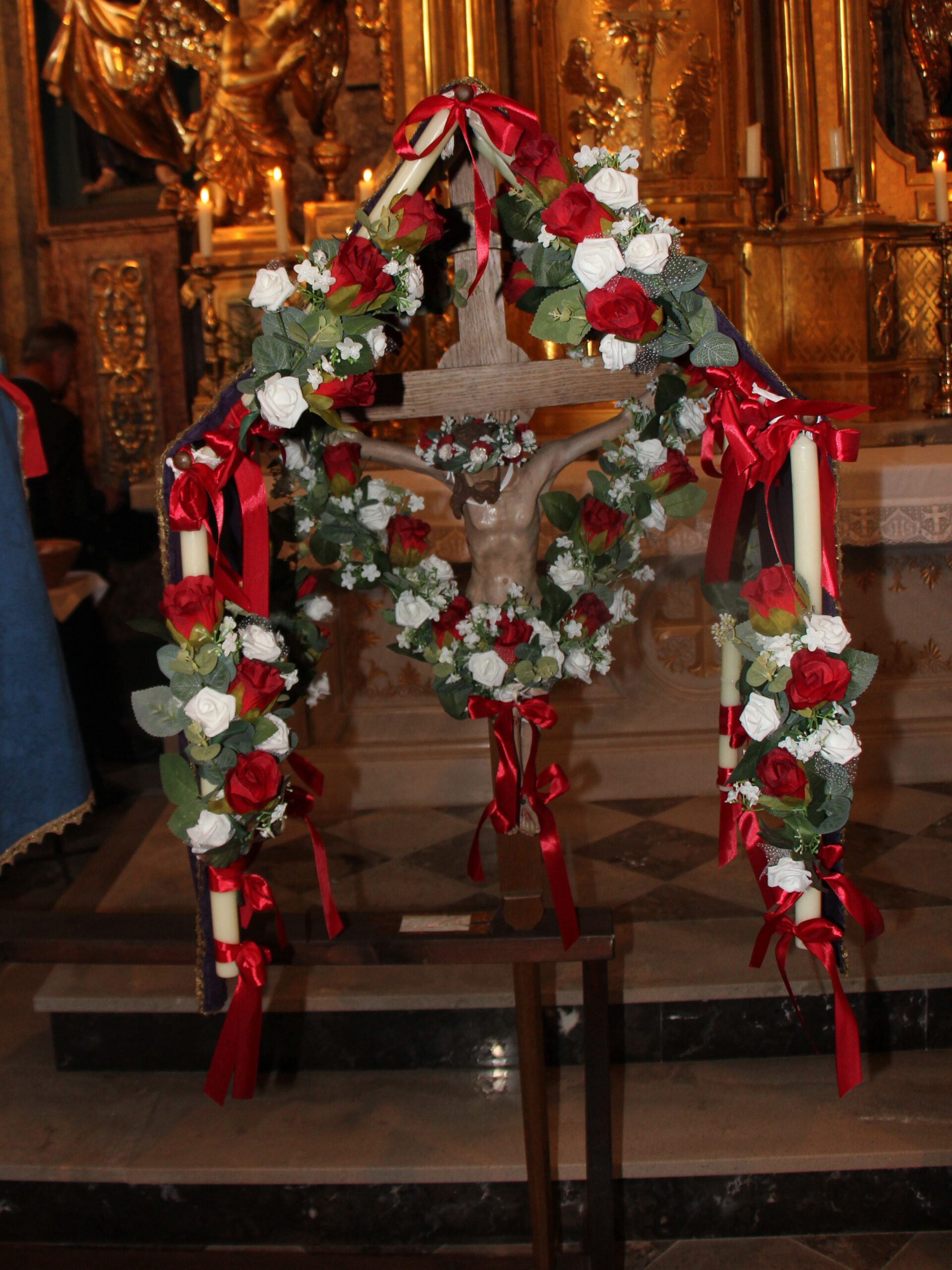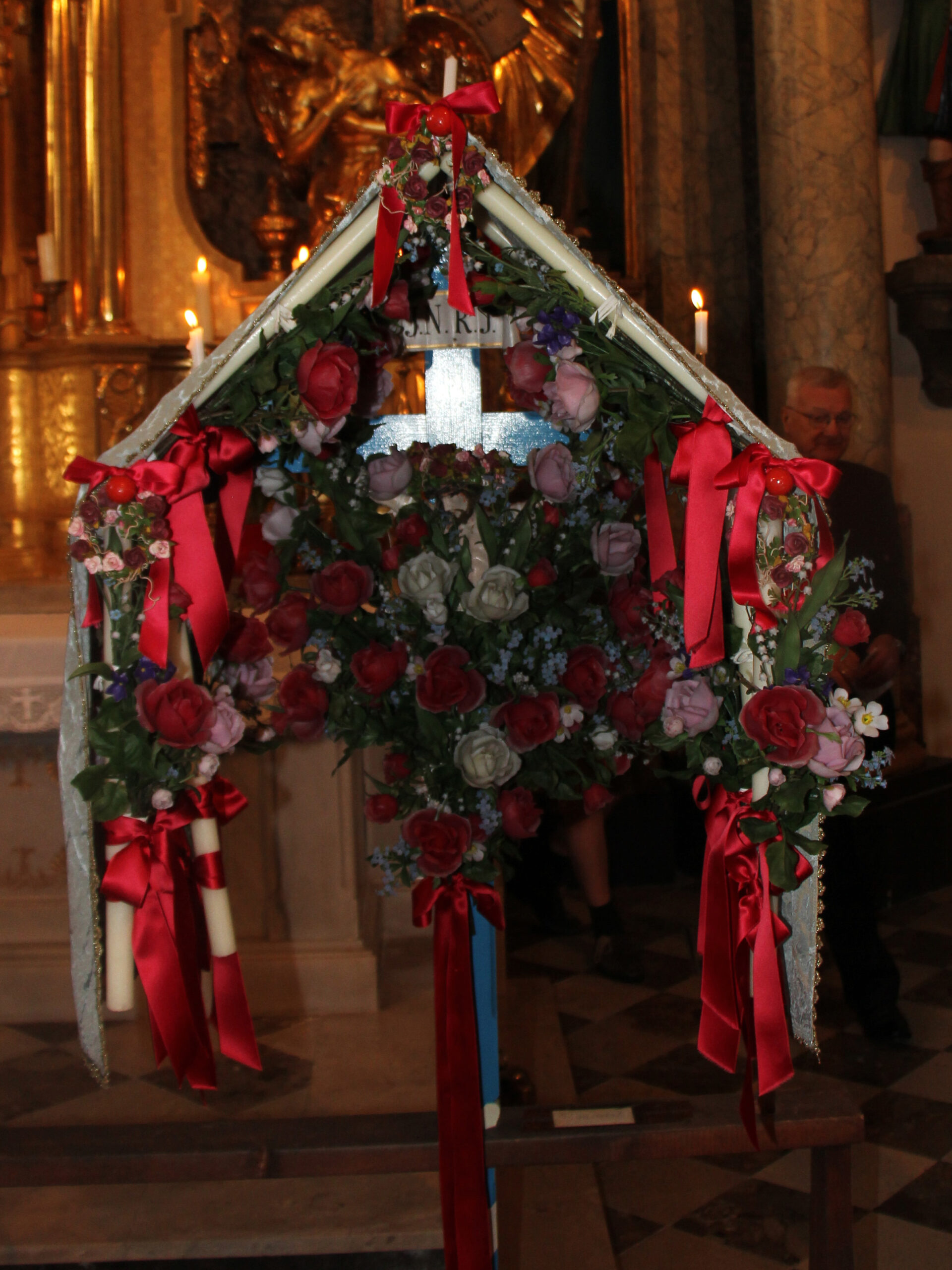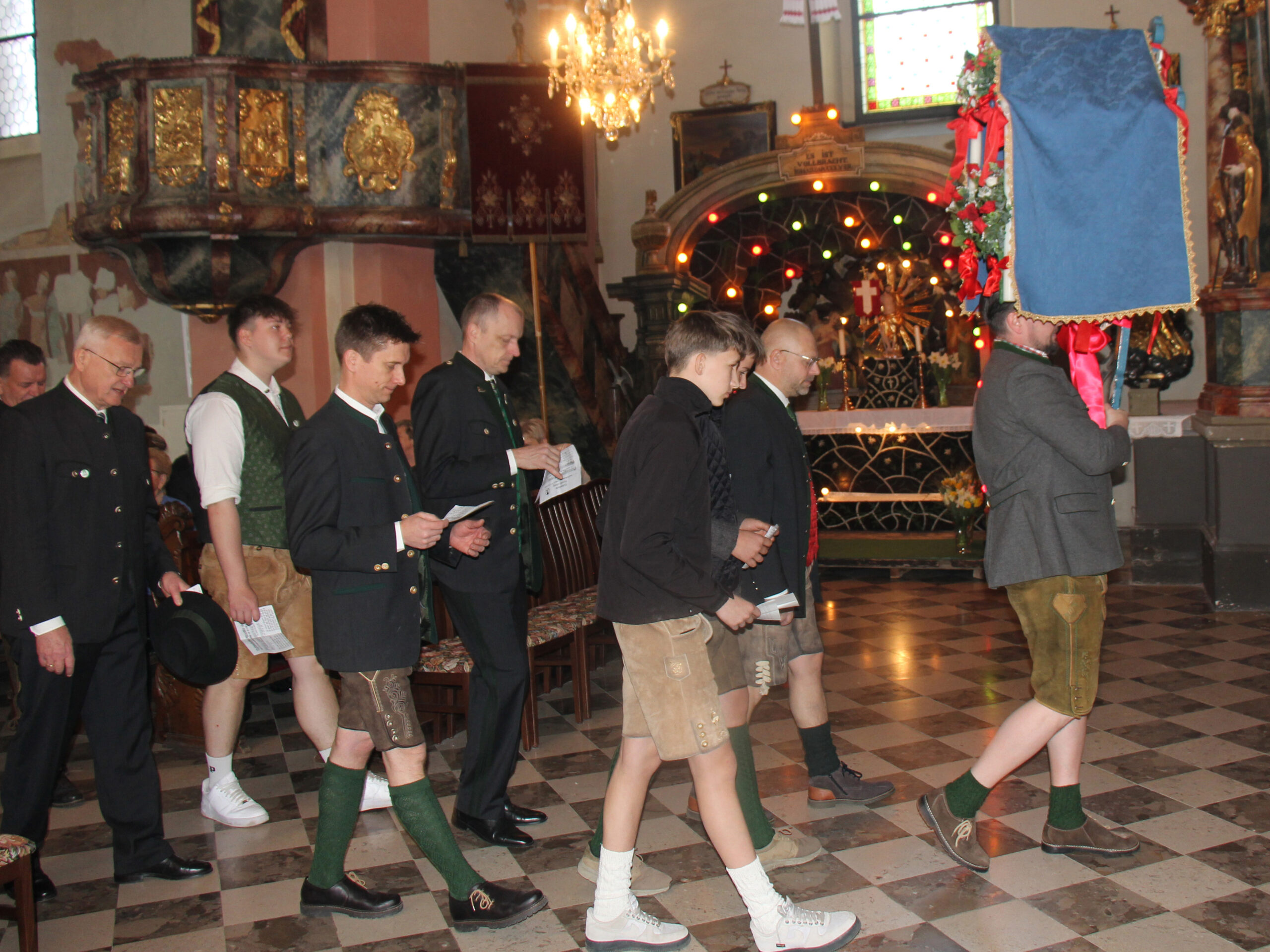 Nach Erreichen der Kirche hat jede Gruppe, natürlich mit bleibendem Gesang, diese umrundet und danach die Kirche betreten. Die Sänger gingen um den Altar und machten Platz für die nächste Gruppe, während der Kreuzträger sein mit Blumen und Kerzen geschmücktes Vortragskreuz vor dem Altar abstellte. Diese verbleiben beim Altar bis zum Festtag „Christi Himmelfahrt“.