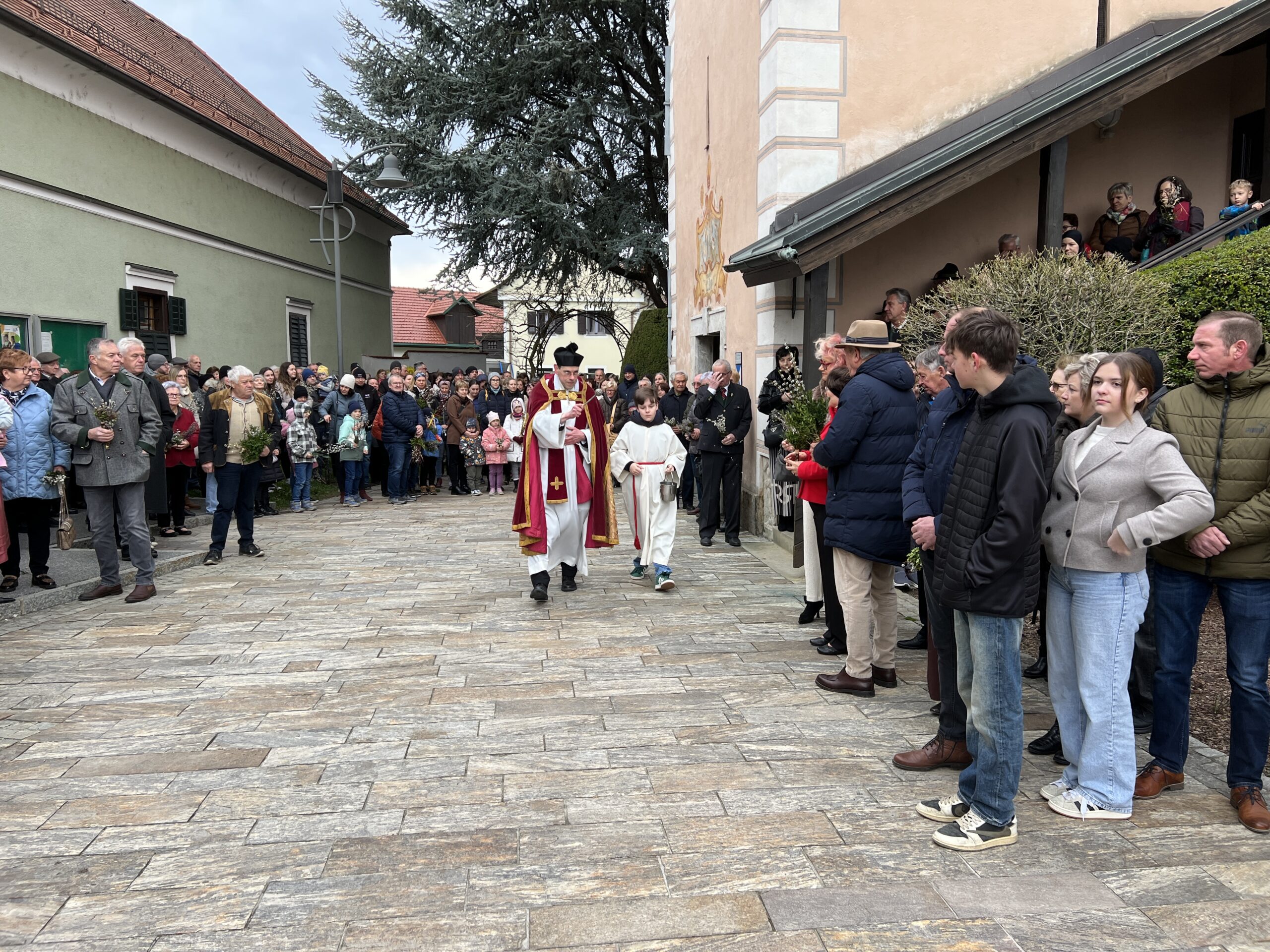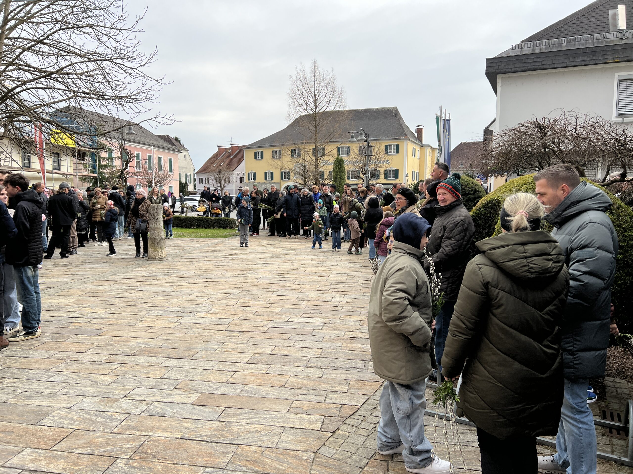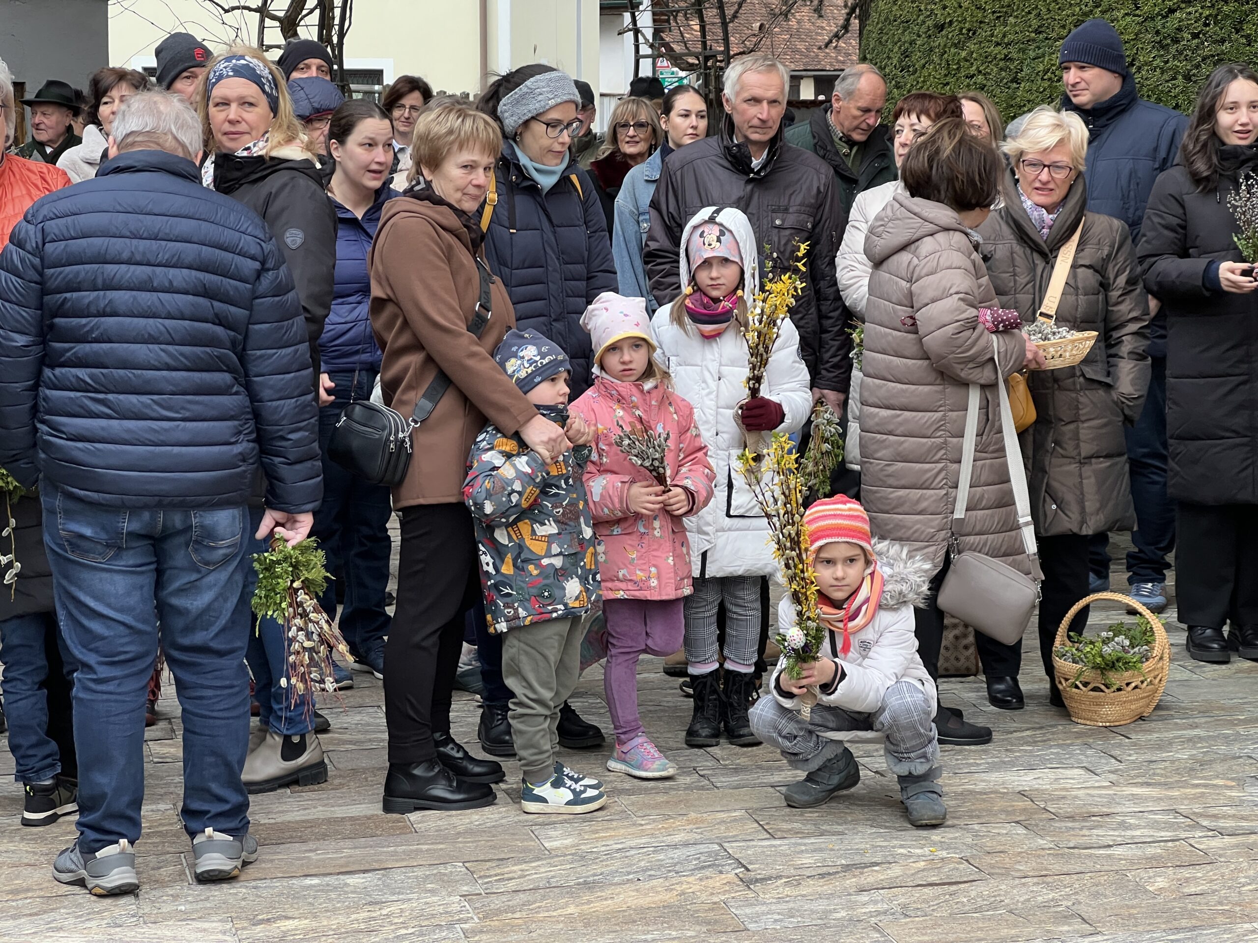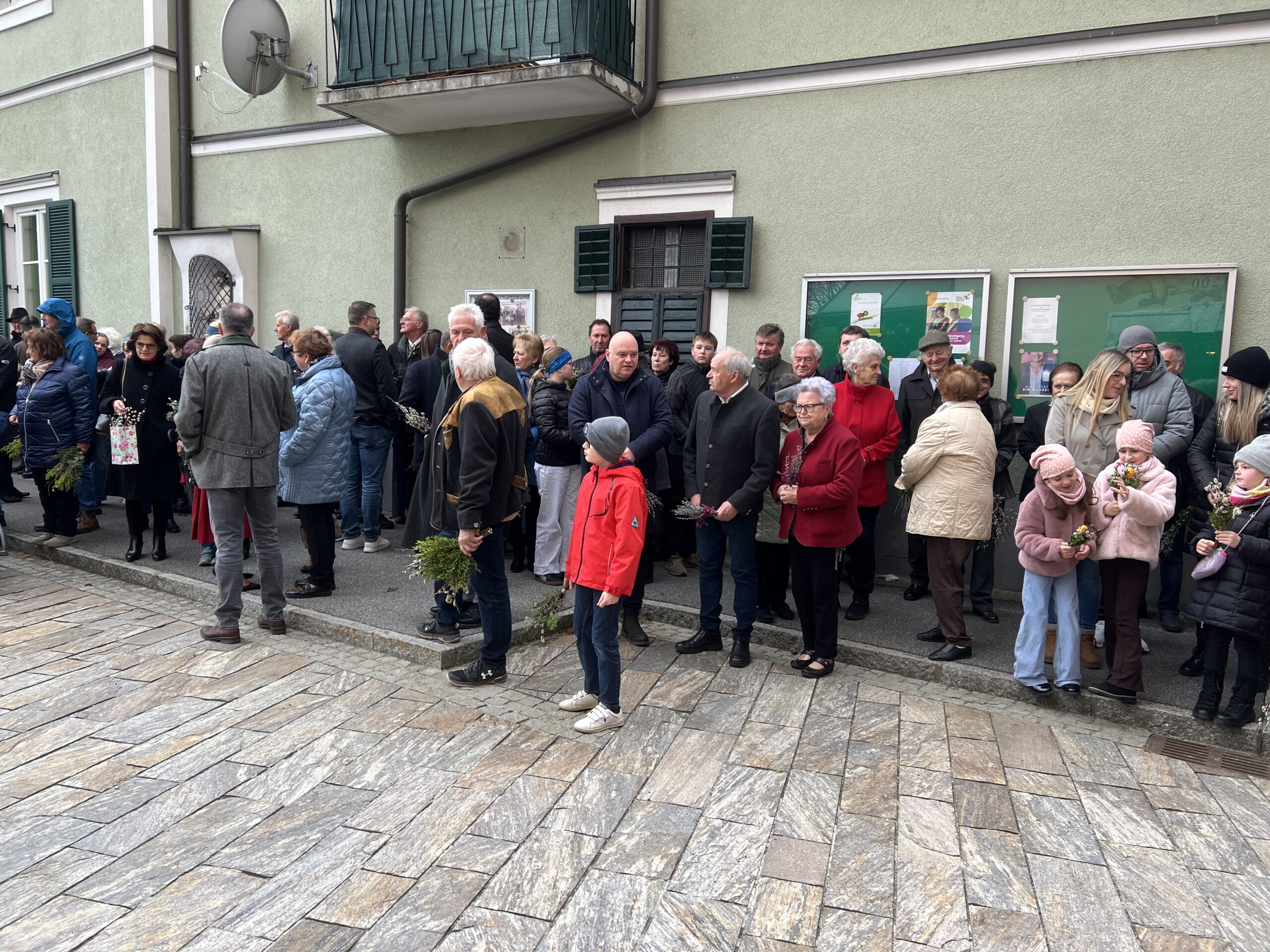 Vor der Pfarrkirche haben sich trotz winterlichen Temperaturen unzählige Bewohner mit kleinen und größeren Palmgestecken eingefunden. Diese wurden von Provisor Mag. Wolfgang Pristavec gesegnet.