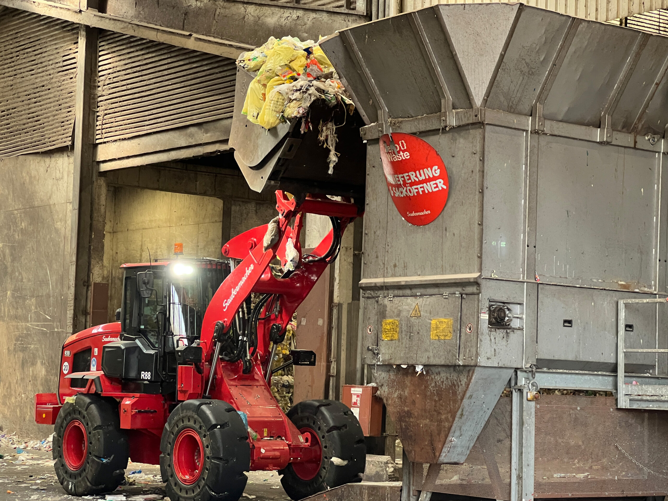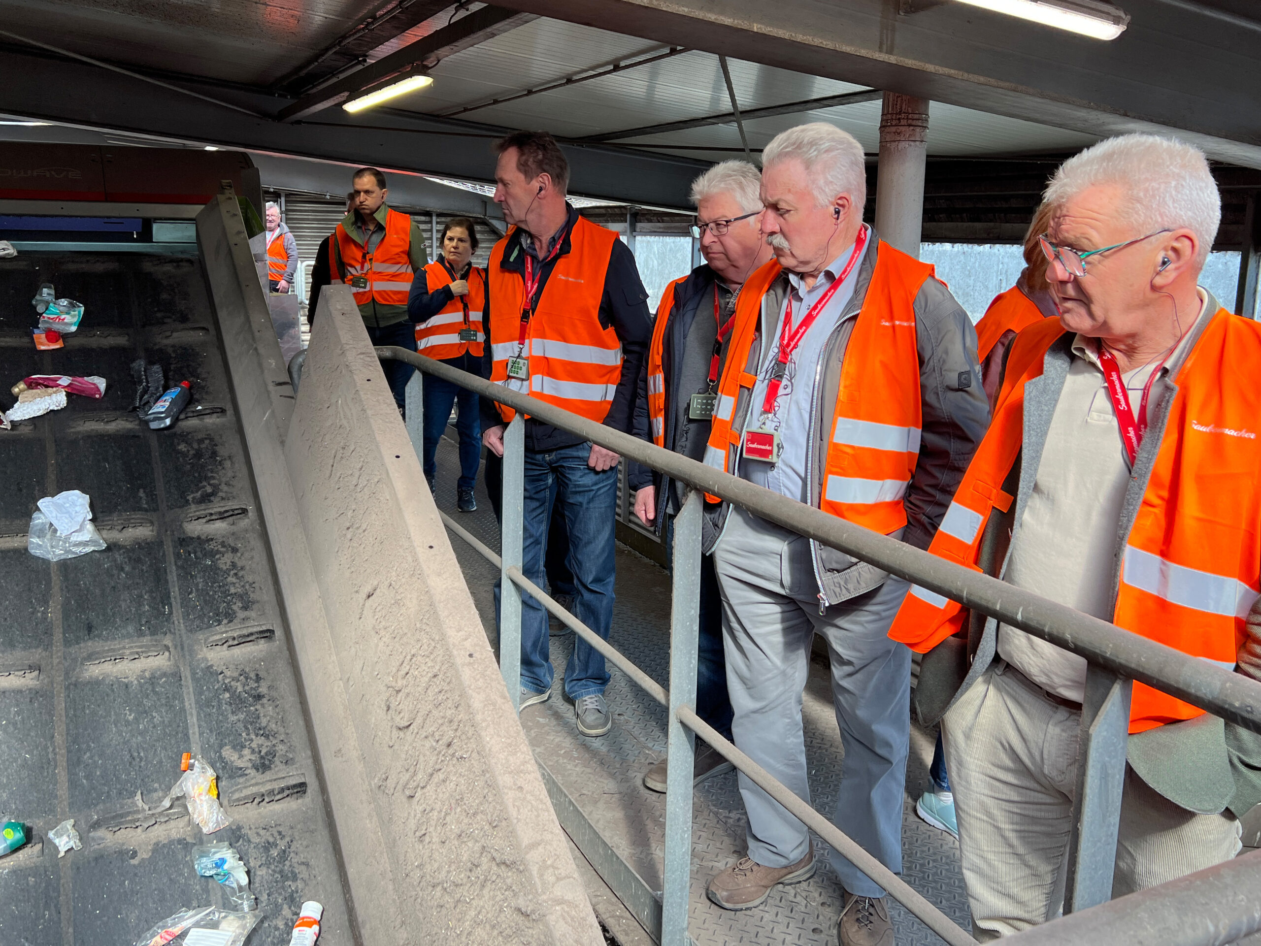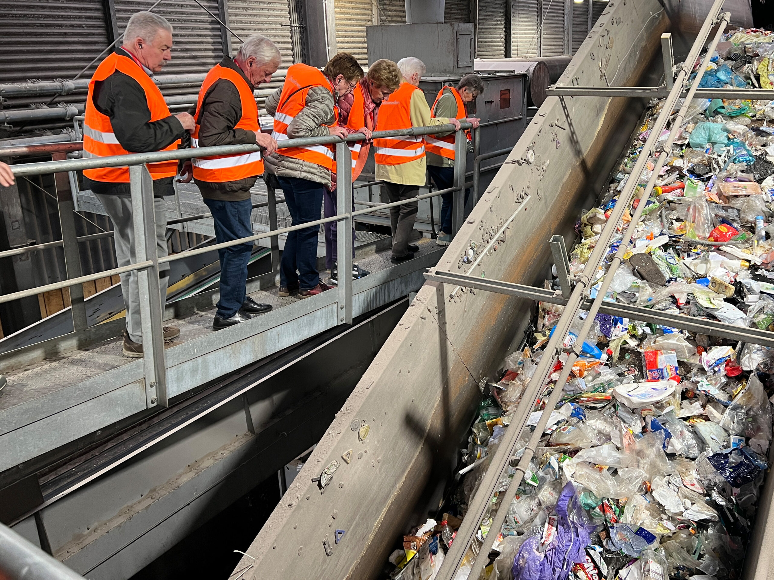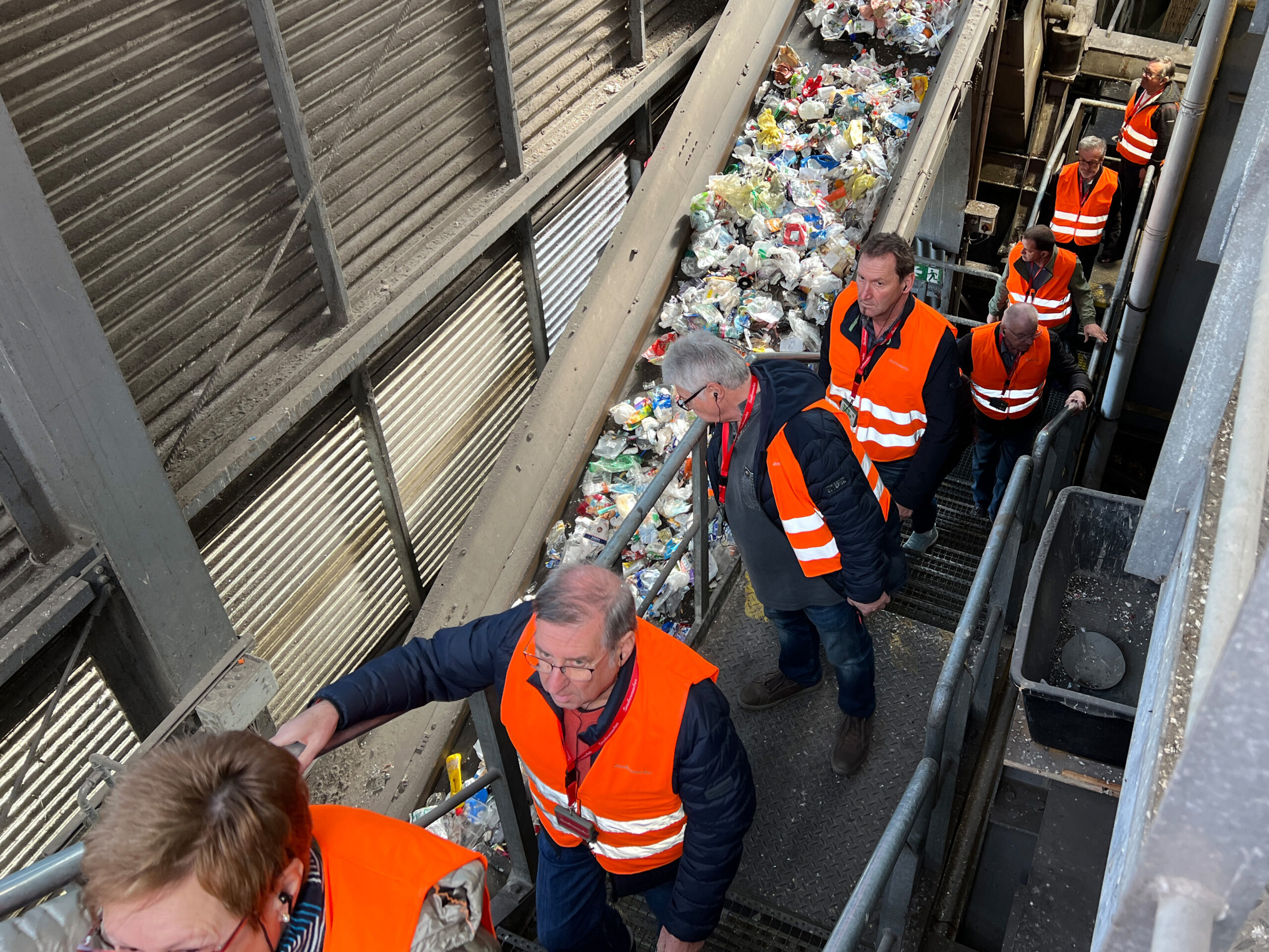 Bei einer informativen Führung erhielten die Teilnehmer*innen spannende Einblicke in die Sortiertechnik. Mithilfe modernster Sensoren, Sieb- und Luftstromtechnik werden die angelieferten Abfälle in 14 verschiedene Fraktionen getrennt. Die Verwertungsquote liegt bei beeindruckenden rund 98 %. Besonders eindrucksvoll waren die tonnenschweren Kunststoffballen, in denen sorgfältig vorsortiertes Material für den Wiedereinsatz in der Produktion bereitsteht. Über 80 % der Kunststoffe werden dem Stoffkreislauf wieder zugeführt.