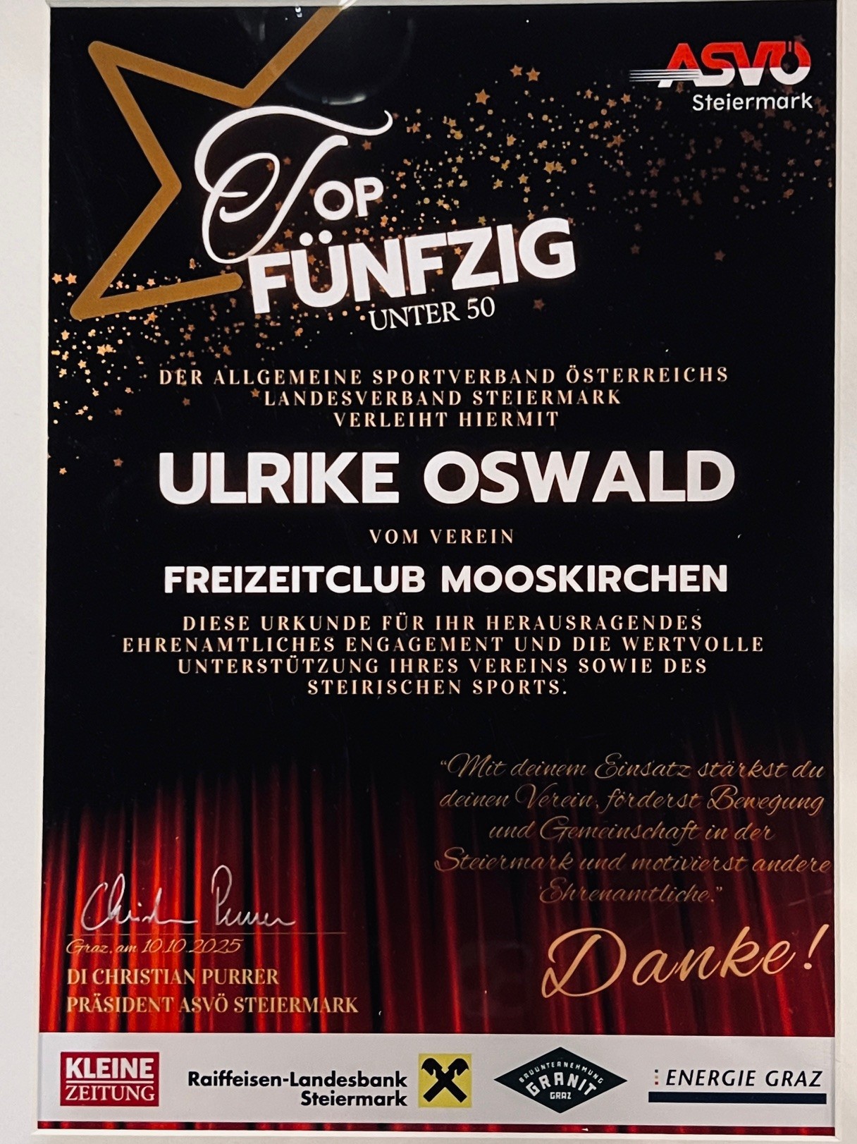 Wir vom Freizeitclub Mooskirchen nominierten Ulrike Oswald, Sektion Tennis, für ihren großartigen Einsatz. Sie wurde aus den rd. 200 Nominierungen von einer fachkundigen Jury unter die Top 50 gewählt.