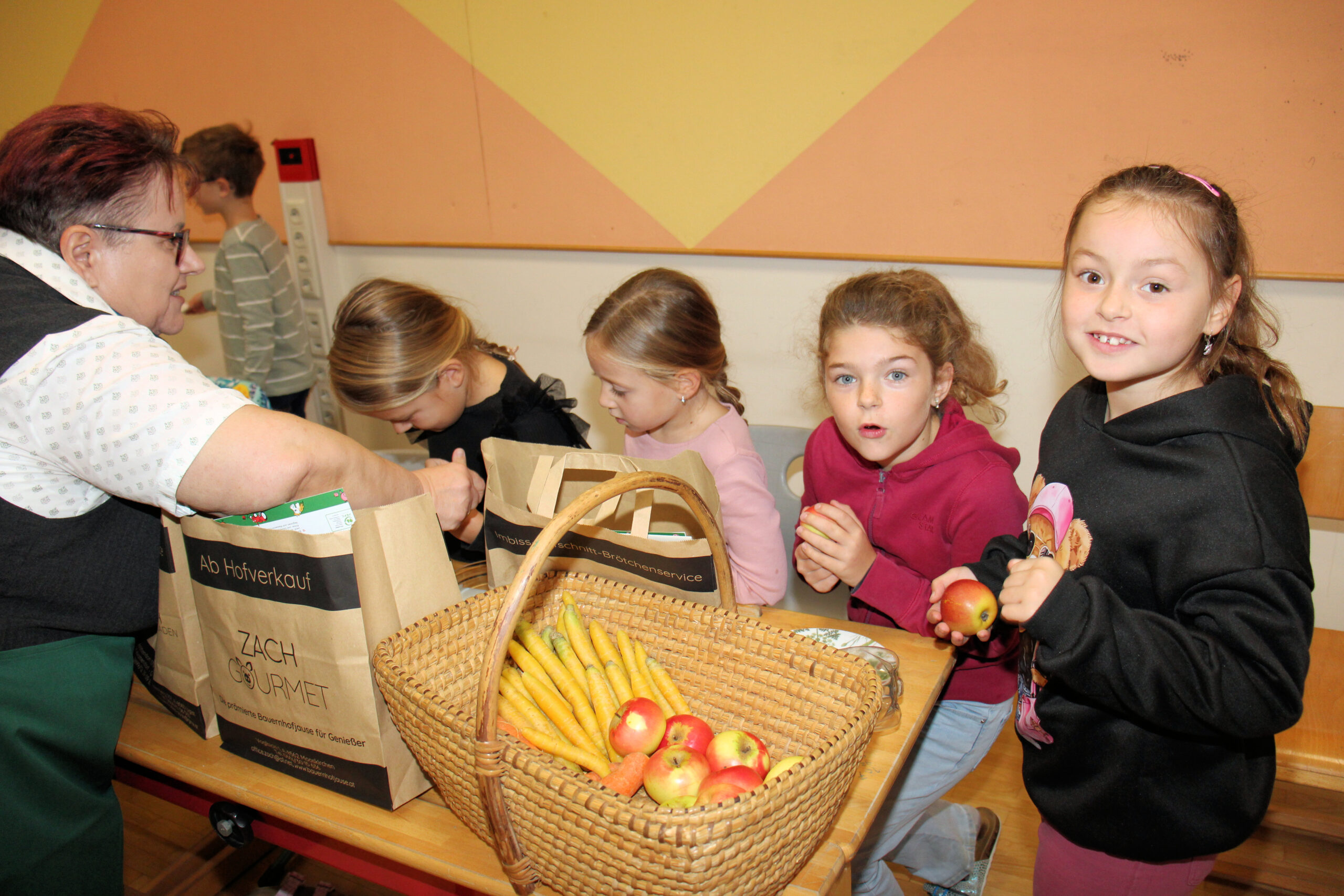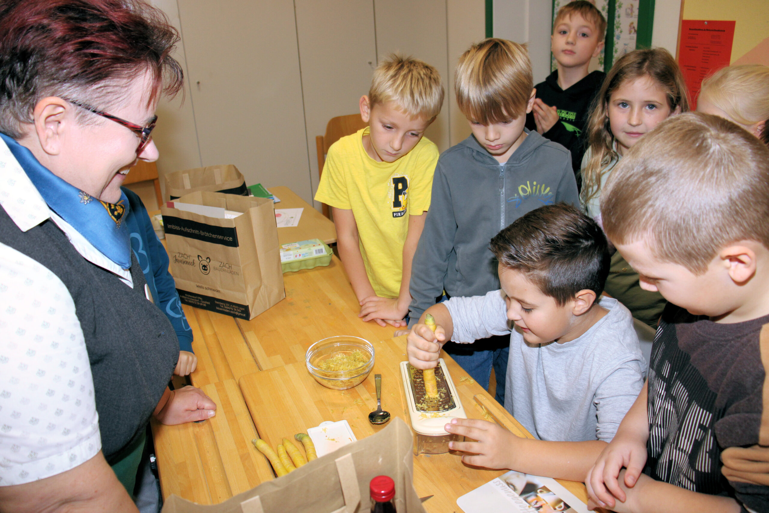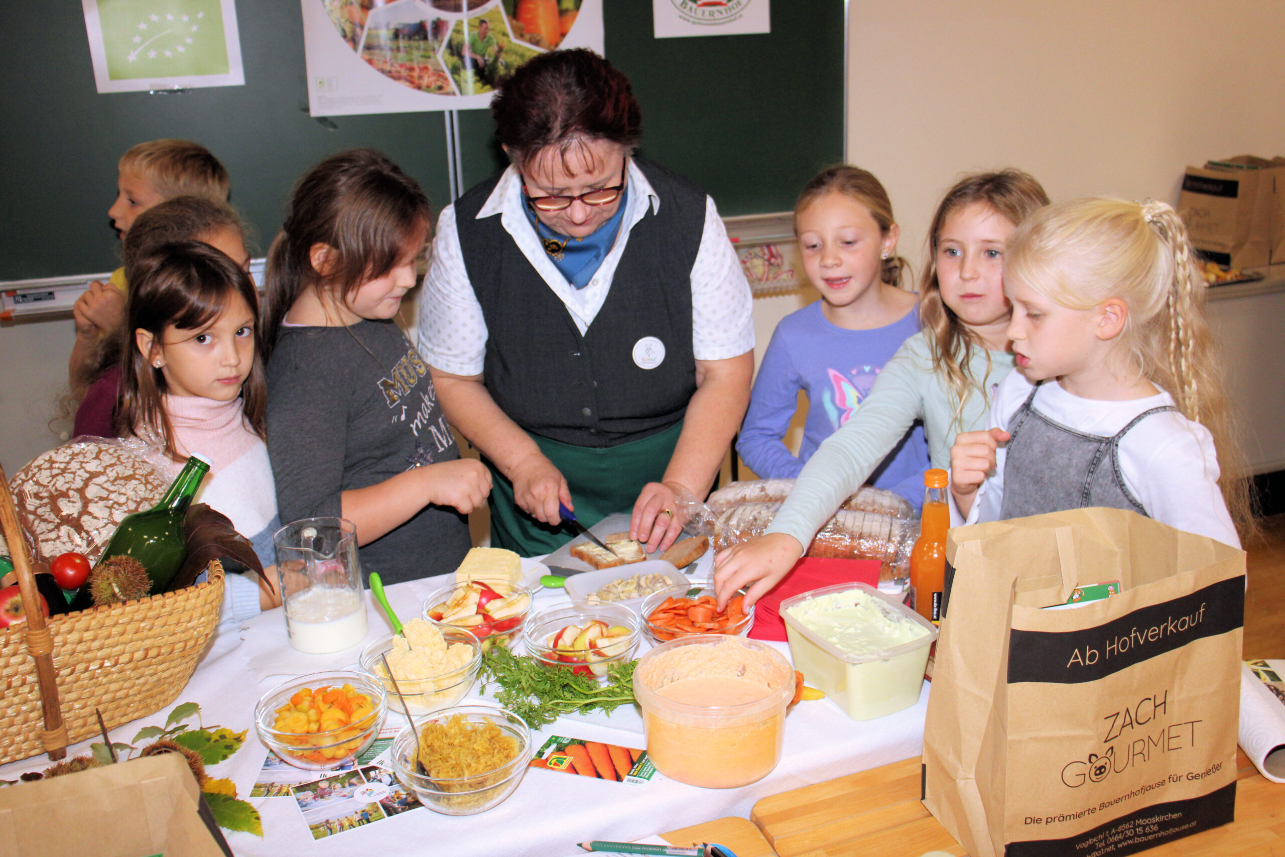 In Mooskirchen wurden die zwei Unterrichtseinheiten von Gemeindebäuerin Barbara Schneebauer und Ulrike Thonhauser gestaltet. Zunächst wurden grundsätzliche Informationen zur Karotte vermittelt, Gütesiegel näher unter die Lupe genommen und anschließend ging es ins aktive Tun. Vom Butter shaken über Äpfel schneiden und Karotten reiben für die gesunde Jause stand auch noch vertiefende Wissensvermittlung am Plan.