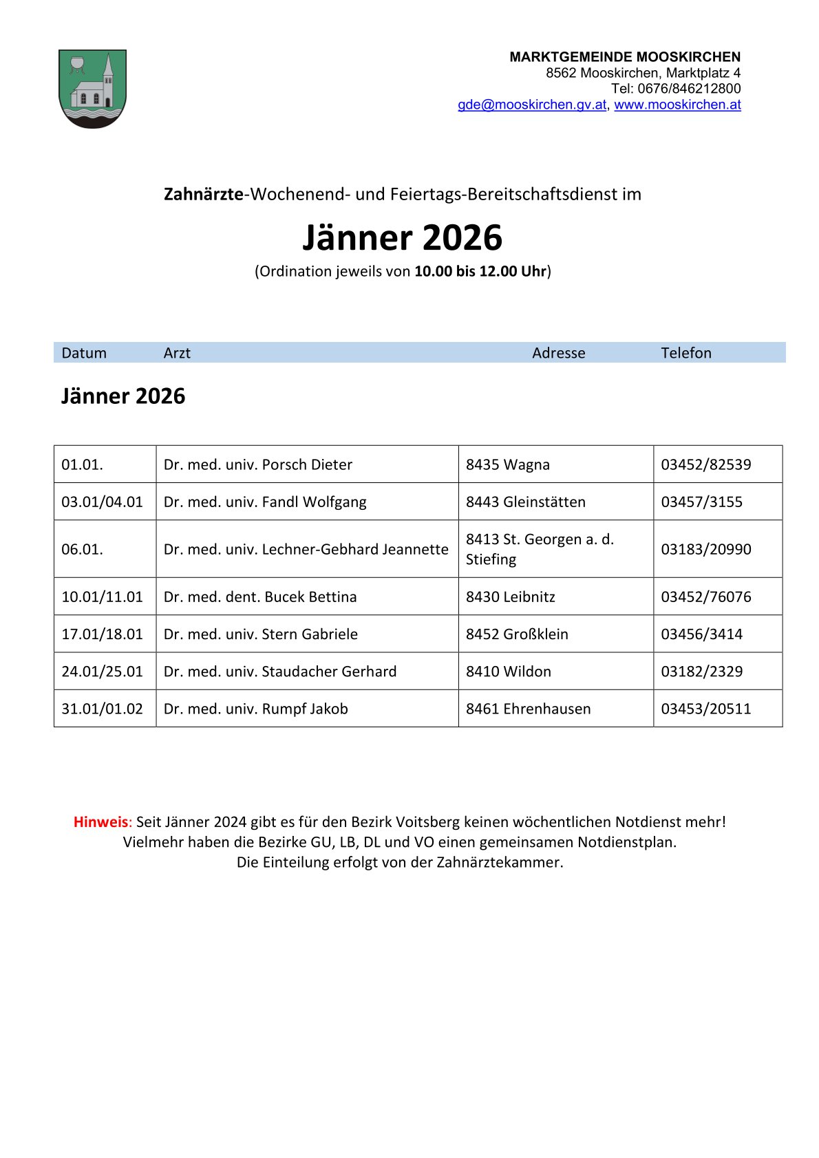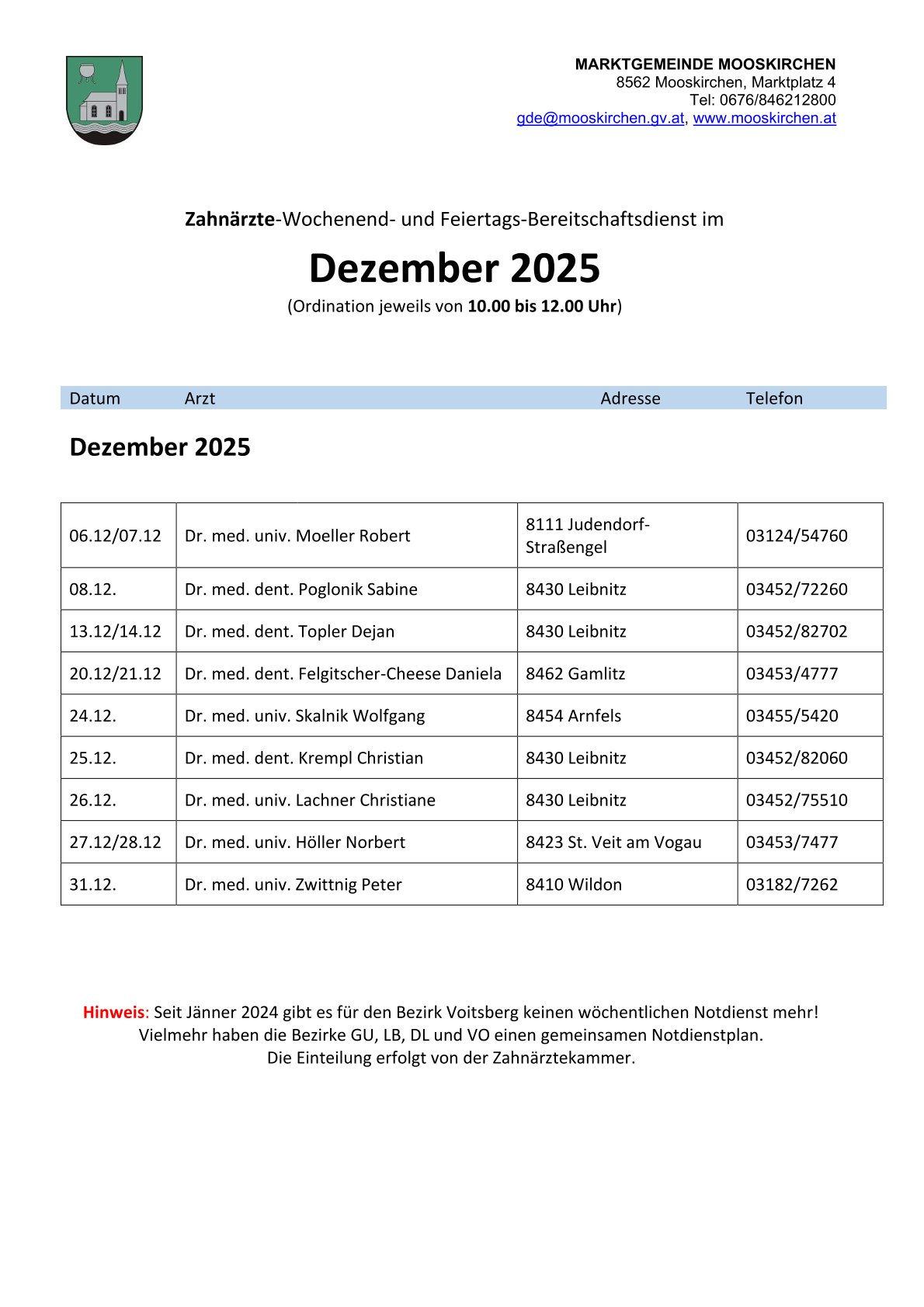 Zahnarzt-Notdienste Der Übersicht unten entnehmen Sie bitte die diensthabenden Zahnärzte an Wochenenden und Feiertagen in den MonatenDezember 2025 + Jänner 2026 Die online NOTDIENSTSUCHE der Landeszahnärztekammer Steiermark erreichen Sie unter https://stmk.zahnaerztekammer.at/patientinnen/notdienstsuche