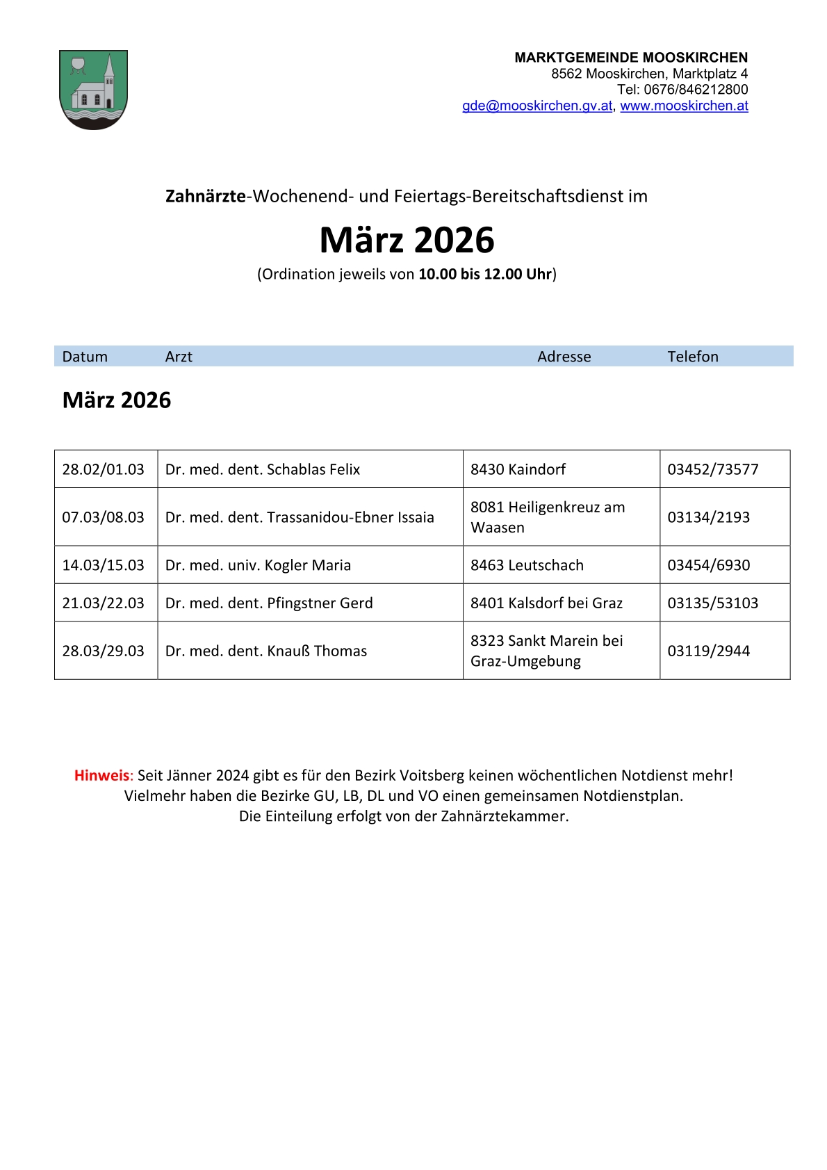 Zahnarzt-Notdienste Der Übersicht unten entnehmen Sie bitte die diensthabenden Zahnärzte an Wochenenden und Feiertagen in den MonatenFebruar + März 2026 Die online NOTDIENSTSUCHE der Landeszahnärztekammer Steiermark erreichen Sie unter https://stmk.zahnaerztekammer.at/patientinnen/notdienstsuche
