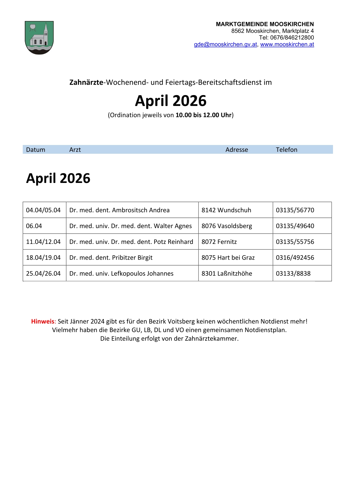 Zahnarzt-Notdienste Der Übersicht unten entnehmen Sie bitte die diensthabenden Zahnärzte an Wochenenden und Feiertagen in den Monaten März und April 2026 Die online NOTDIENSTSUCHE der Landeszahnärztekammer Steiermark erreichen Sie unter https://stmk.zahnaerztekammer.at/patientinnen/notdienstsuche